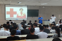 下午4:20,讲座正式开始,本次讲座主要内容有出血包扎、擦伤、肌肉韧带拉伤、肌肉痉挛、运动腹痛、昏迷、休克、中暑、烧烫伤、气道梗塞等急救知识讲解,搬运伤员方法,心肺复苏方法等。除了在理论上讲授急救知识外,赵老师还教授了实际操作过程中的注意事项,从现实方面帮助同学们掌握急救措施的运用。在活动中,赵老师一边讲解,一边做出示范。同学们一边聆听讲解,一边观察具体行动,纷纷若有所悟地点点头。接下来,现场的同学们就生活中常见的创伤和急救措施积极提问,孙医生走下讲台,为同学们一一解答疑惑。赵老师用幽默的语言,为同学们生动地解疑,现场提问气氛愈发活跃,互动交流非常热烈。