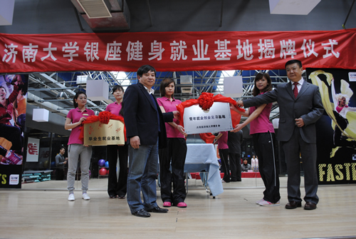 毕业生就业基地、青年就业创业见习基地揭牌仪式在山东省银座健身发展有限公司举行。出席此次揭牌仪式的有学院党委书记周明、学院院长杨磊、学院党委副书记、副院长张良红、学院副院长亓圣华、学院学办主任、团委书记李春海、山东银座健身发展有限公司总经理付维新、市场营销部总监王仁磊、综合管理部总监赵霞等。