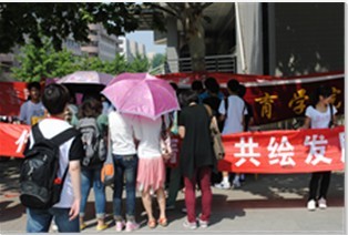 西校区八食前广场举办了以“传承五四精神 共绘发展蓝图”为主题的签字活动。