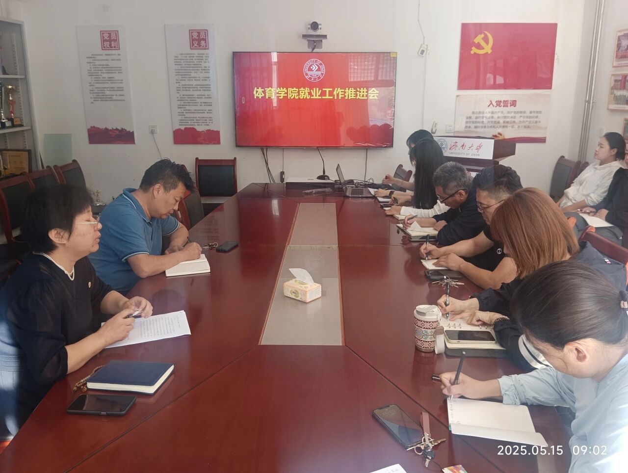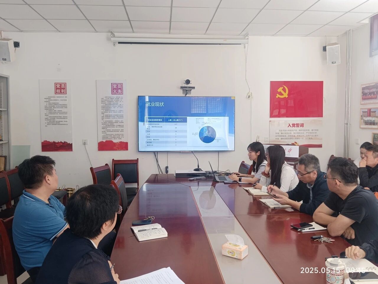 随后,学生工作办公室主任王梦晗对2025届毕业生就业工作情况进行了详细汇报。她从毕业生基本情况、当前就业进展、存在的问题与困难等方面展开分析,通过数据清晰呈现了目前学院就业工作的现状,并针对现存问题提出了下一步的工作思路和计划,为后续就业工作的推进提供了数据支撑和方向指引。
