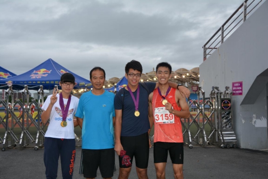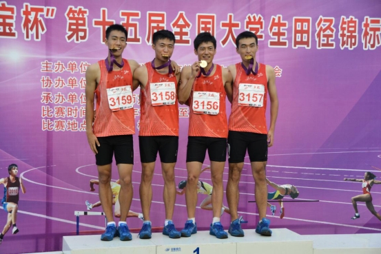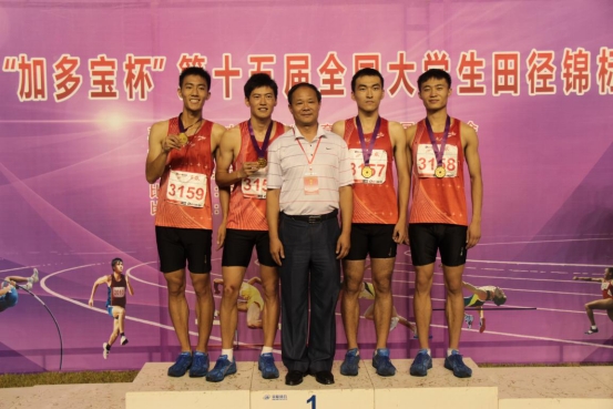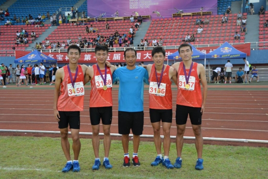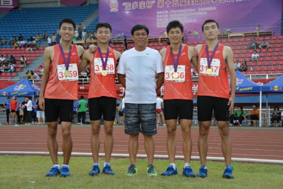 图8 领队杨磊院长(中)与获得4*400米接力冠军的队员合影,左起:魏严宸、刘振、杨磊院长、杨德麒、马炎