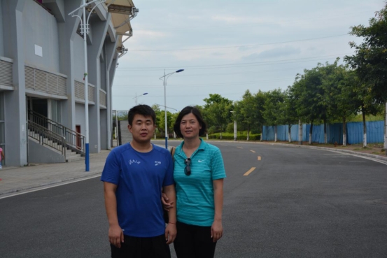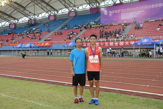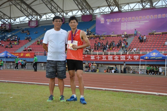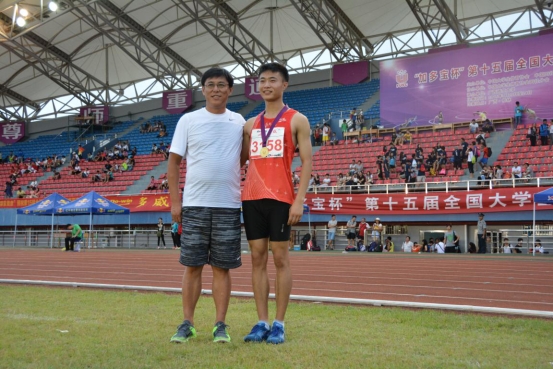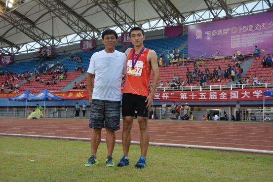 图19 教练员李保安与获得男子乙组4*100米、4*400米接力冠军、400米第4名的马炎同学合影